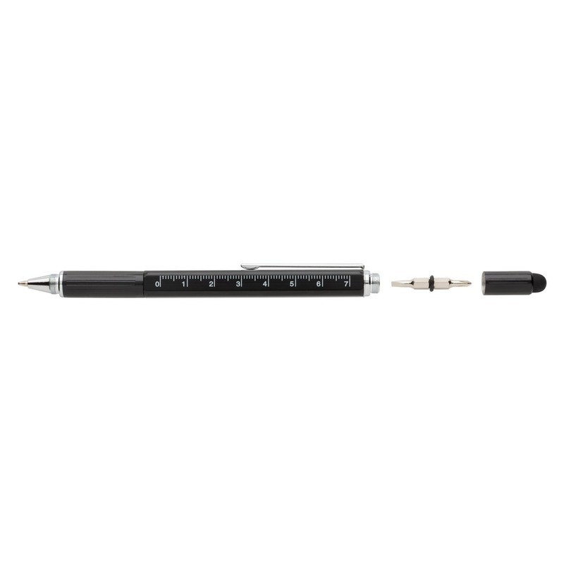 Długopis wielofunkcyjny (5 w 1: linijka, poziomnica, śrubokręt, touch pen), wykonany z mosiądzu, aluminiowy klip, długość pisania 400m. Znakowanie: logo grawer