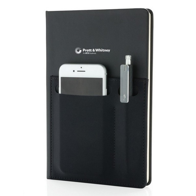 Notatnik A5 (80 kremowych kartek 80 g/m2 w linie), kieszenie na okładce, w tym na telefon (do 8 cm szerokości), miejsce na przybory do pisania, duża kieszeń na dokumenty. Znakowanie: logo 1 kolor